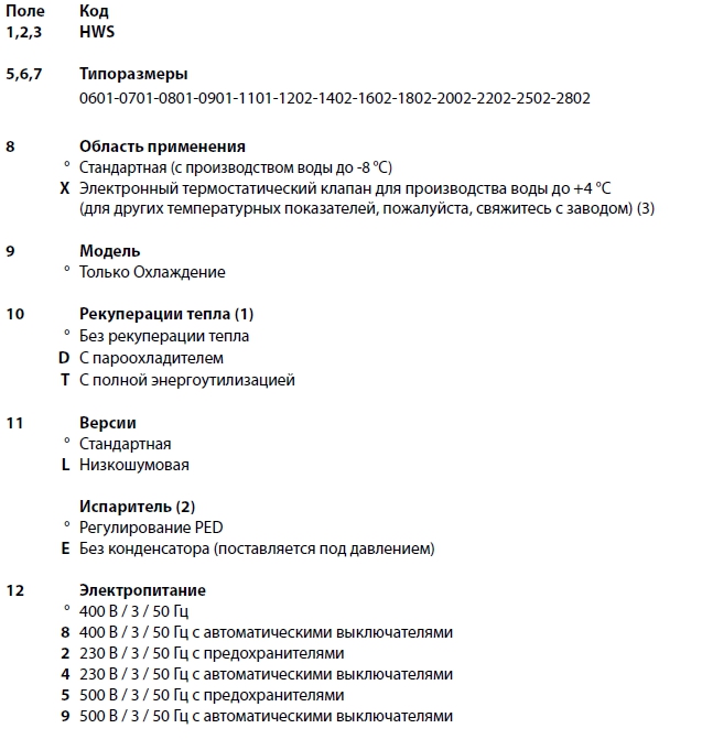 (1) Пароохладитель и рекуператор не доступны для типоразмеров 0601 и 1202; T несовместимы с E