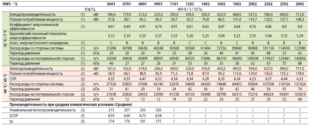 (1) Температура воды на стороне системы (вход/выход) 12 °C / 7 °C; геотермальная вода (вход/выход) 30 °C / 35 °C
