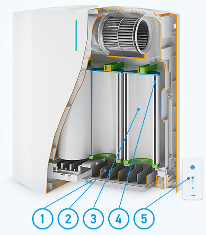 Проходя через электростатический блок (2), механические загрязнители и биоаэрозоли приобретают электростатический заряд и эффективно осаждаются на объемном HEPA-фильтре.
