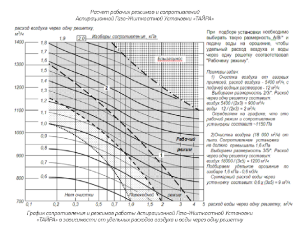 Основой для подбора конструкции Аспирационной Газо-Жидкостной Установки «ТАЙРА» и режимов ее работы служит «График сопротивления и режимов работы Аспирационной Газо-Жидкостной Установки "ТАЙРА"». Этот график составлен разработчиками на основе эмпирических испытаний и подтвержден многолетними показаниями работающих установок на реальных объектах.