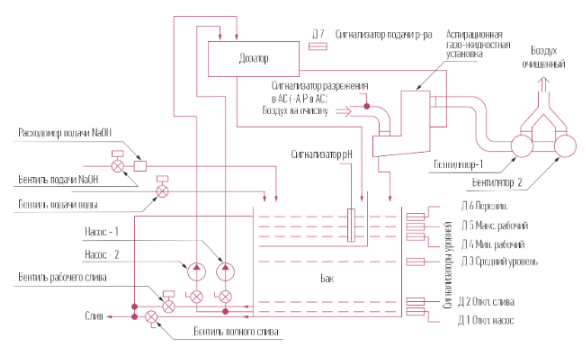 Функциональная схема аспирационной системы для очистки воздуха от газовых примесей с оборотной схемой водоснабжения и добавлением химического реагента (NaOH).