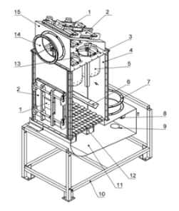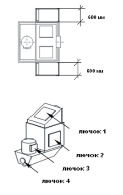 На рисунке 3 показаны места расположения лючков для сервисного обслуживания установки Лючок 1 – для обслуживания отводящего короба и сепаратора установки. Лючок 2 – для обслуживания узла подачи воды в установку и распылительной решетки. Лючок 3- для обслуживания входного патрубка. Лючок 4 – для осмотра и очистки поддона.