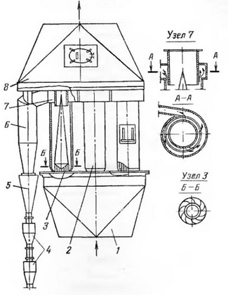 Исполнение секционное, с рециркуляцией части запыленного газа через одиночный циклон ЦН-15.