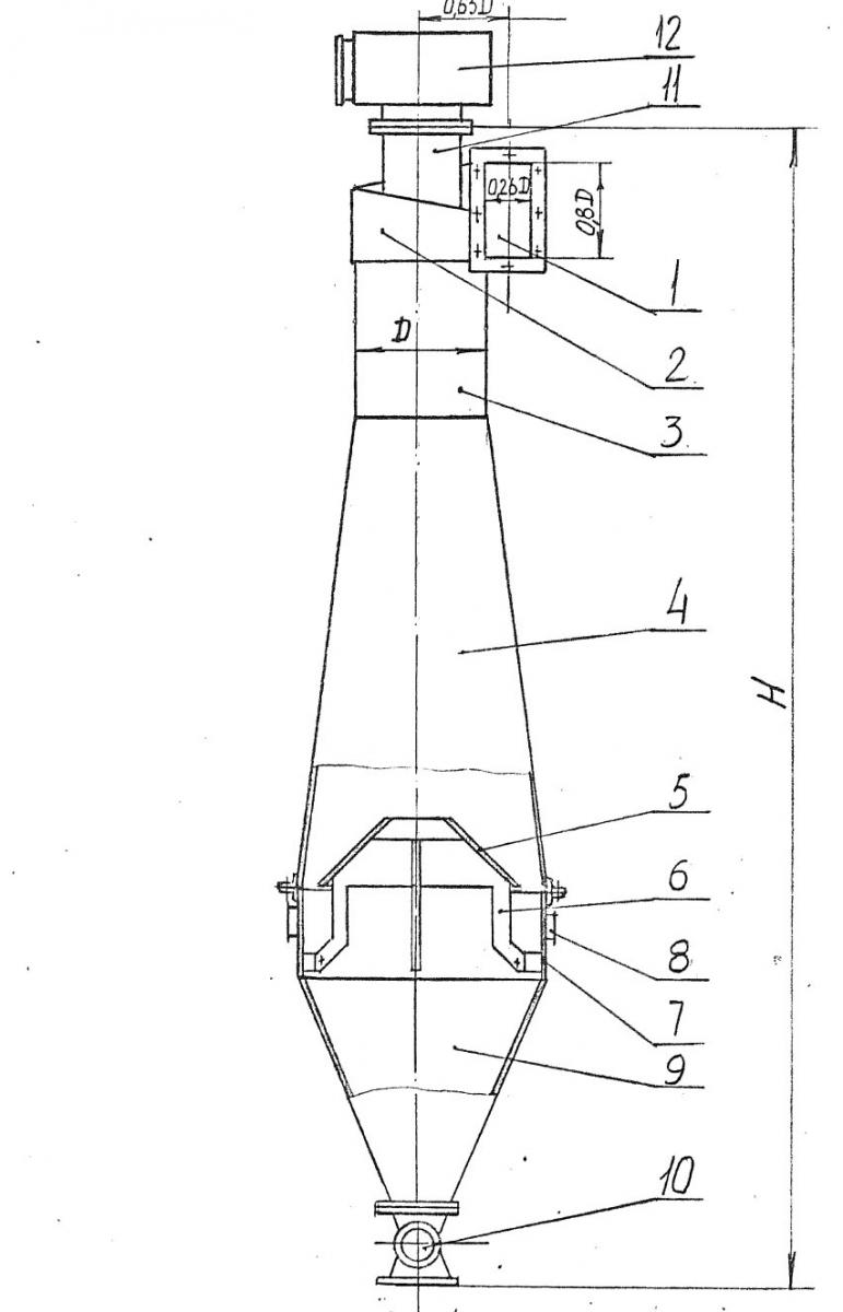 Циклон состоит из входного узла 1, формирующего пылевоздушный поток, с входным патрубком 2 прямоугольного сечения шириной 0,26D и высотой 0,8D (Здесь D — диаметр цилиндрической части корпуса циклона, являющийся базовым размером)
