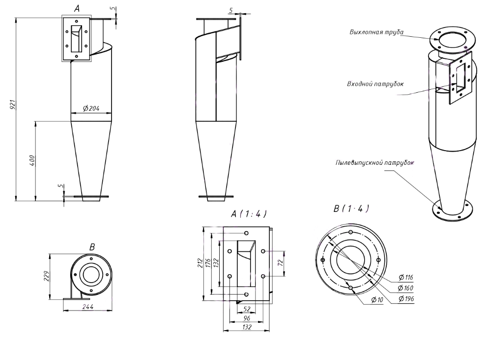 Конструкция циклона выполнена из прочной стали с использованием гнутых и сварных элементов. Основной особенностью этого типа цилиндро-конических устройств является входной патрубок, установленный под углом к горизонтальной плоскости, и спиралевидная крышка, наклон которой соответствует углу патрубка.