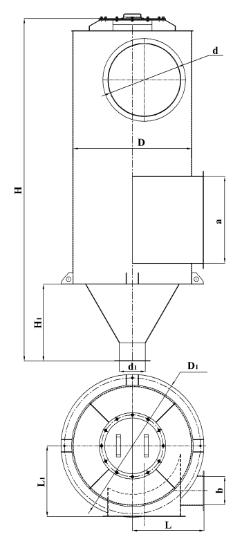 Круглый выходной патрубок циклона утоплен внутрь корпуса аппарата на величину 0,1D и смещен в сторону оси на расстояние 0,1D.