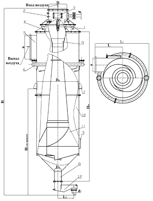 В нижней части устройства находится закручивающее устройство, через которое отводится шлам через конусный отделитель. Корпус включает в себя патрубок, конфузор, горловину и диффузор. Воздушный поток разделяется на два в камере, где происходит удаление капель воды с пылью. Очищенный воздух выводится через патрубок.