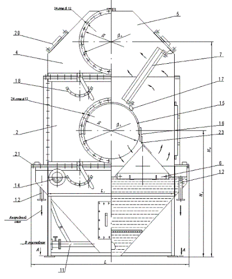 Нижняя секция состоит из опоры-поддона 1, в котором установлены фильтры. Средняя секция состоит из панелей передних 2 и боковых. Короба 4, 5 образуют верхнюю секцию. Между опорой-поддоном и панелями установлены перегородки направляющие 6. Между панелями и коробами верхними установлены сепараторы 7.