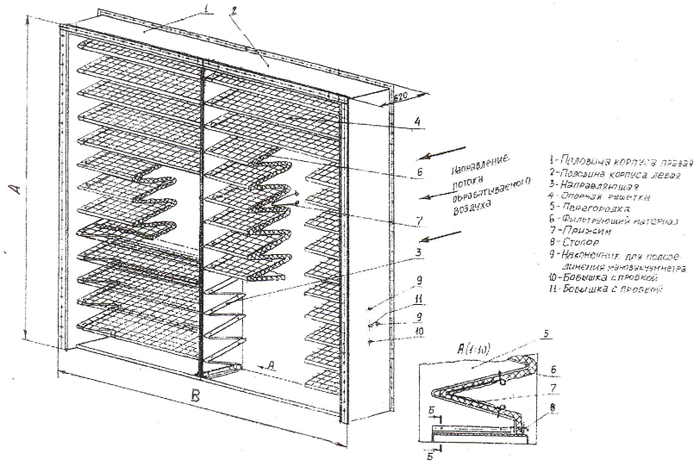 На статичных решетках и зигзагообразных направляющих специальными прижимами закрепляется фильрующий материал.