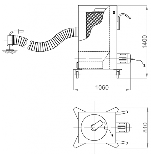 Фильтр оснащен вентилятором, пусковой аппаратурой, кабелем питания длиной 5 метров и разъемом для подключения к электросети. В комплект также входит воздухоприемное устройство в виде гибкого воздуховода диаметром 160 мм и длиной 5 метров, заканчивающегося воронкой на магнитном основании.