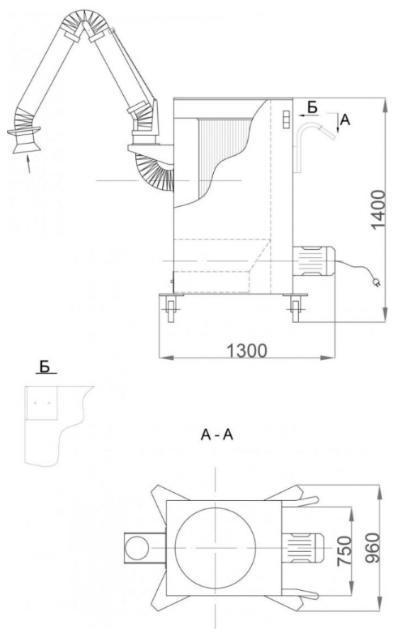 Фильтр состоит из корпуса с входным патрубком и ножками для установки на пол. Внутри корпуса, по направлению воздушного потока, установлен отбойник, который предотвращает попадание крупных частиц, окалины и искр на основные фильтрующие элементы картриджного типа.