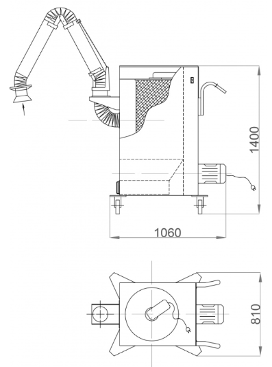Фильтр состоит из корпуса с входным патрубком и ножками для установки на пол. Внутри корпуса, по направлению воздушного потока, установлен отбойник, который предотвращает попадание крупных частиц, окалины и искр на основные фильтрующие элементы картриджного типа.