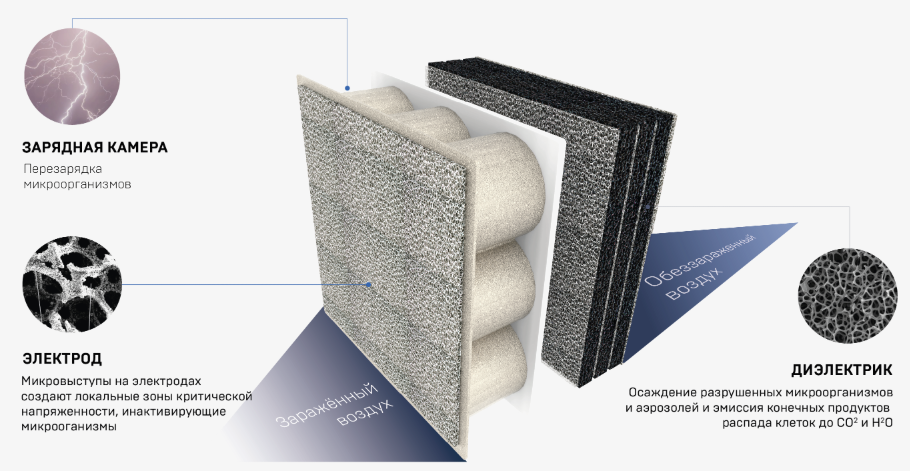 Очистка воздуха осуществляется за счет воздействия на патогенные микроорганизмы постоянными электрическими полями с критической напряженностью, что обеспечивает их полное уничтожение.