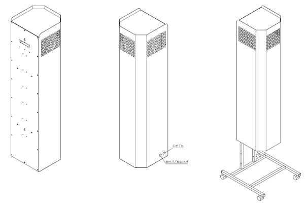Принцип работы основан на принудительной циркуляции воздуха через закрытую камеру устройства. Внутри камеры воздух подвергается воздействию ультрафиолетового излучения с длиной волны 253,7 нм, которое вырабатывают установленные в приборе низконапорные бактерицидные лампы.