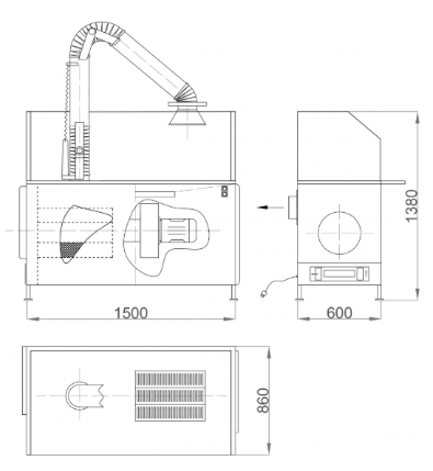 Воздух удаляется одновременно через воздухозаборное устройство и колосники рабочей поверхности, очищается при прохождении через бумажно-тканевой фильтр и затем возвращается в помещение через щелевой воздухораспределитель вдоль задней стороны стола.