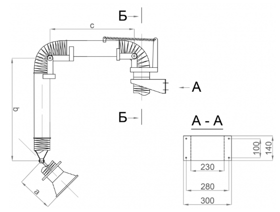 Устройство состоит из воронки и двух жестких воздуховодов, соединенных между собой шарнирными узлами. Для фиксации положения предусмотрены шарниры и фрикционы, а для снижения нагрузки на фрикционные узлы используются разгрузочные пружины.