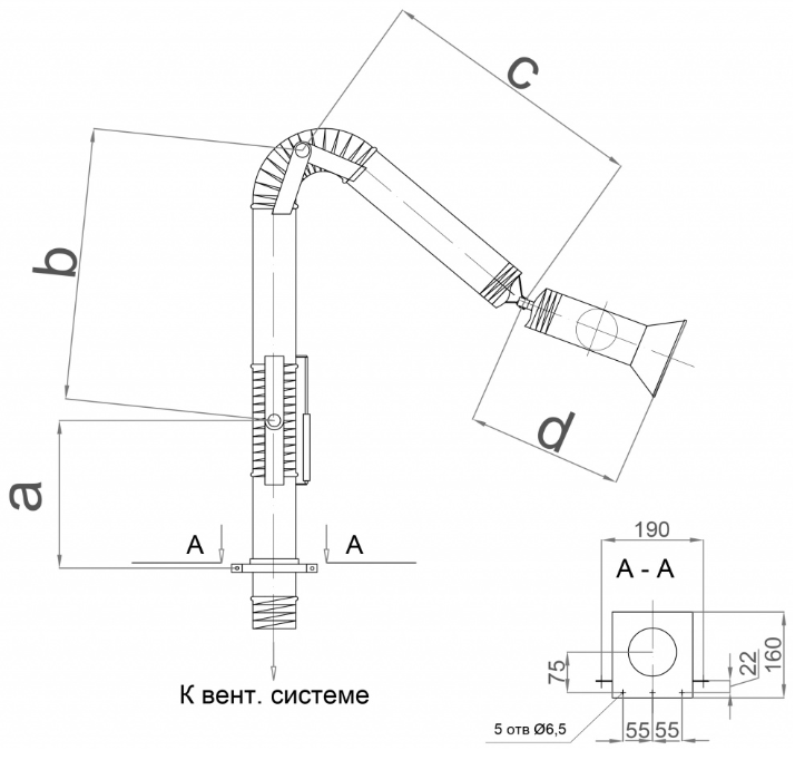 Конструкция устройства предусматривает кронштейн для крепления к стене, колонне цеха или металлическим конструкциям. Рекомендуемая высота установки составляет 40-50 см над рабочей поверхностью. Устройство с верхним подключением устанавливается под опорой. Для подключения к вентиляционной системе, вентилятору или фильтру в комплекте идет гибкий воздуховод (гофрированный шланг) диаметром 85 мм и длиной 0,5 м.