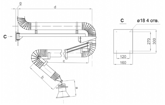 Устройство включает консоль, воронку и два жестких воздуховода, соединенных шарнирно. Фиксация осуществляется с помощью шарниров и фрикционов, а для уменьшения нагрузки на фрикционы используются разгрузочные пружины. Модели с воздуховодами диаметром 160 мм и воронкой диаметром 250 мм рассчитаны на воздушный поток 1000-1200 м³/ч.