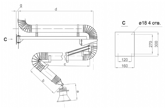 Радиус обслуживания определяется длиной выбранной консоли и типом головной части — самофиксирующегося элемента, который удерживается в нужном положении за счет шарниров: