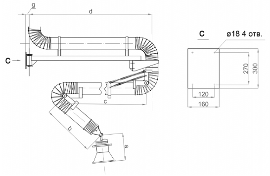 Конструктивно устройство включает двойную консоль, воронку и два жестких воздуховода, соединенных шарнирными узлами. Положение вытяжного устройства фиксируется за счет шарниров и фрикционных элементов, а для снижения нагрузки на фрикционы предусмотрены разгрузочные пружины.