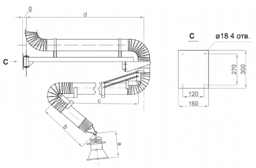 - В комплект входит гибкий воздуховод длиной 0,7 м для подключения к вентиляционной сети, фильтру или вентилятору.