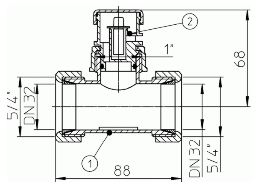 Клапан с Т-образным соединением с двумя накидными гайками 5/4" или 6/4" DN 32 или DN 40.