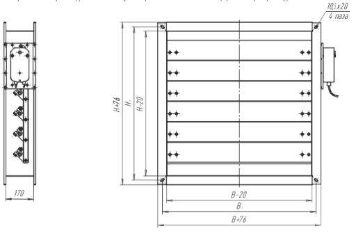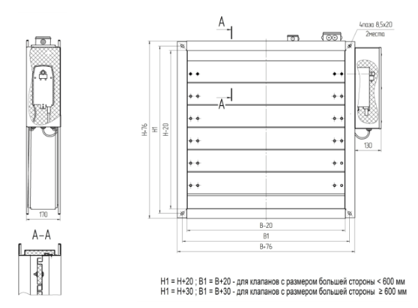 - Н1=Н+20; В1=В+20 для клапана с большей стороной < 600 мм