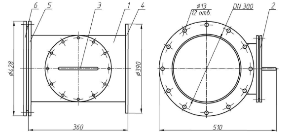 - Корпус-тройник 1 с двумя фланцами 4 и 5 по торцам и боковым люком, который позволяет визуально, а также на ощупь провести проверку состояния и, в случае надобности, прочистить место прижатия тарели клапана герметического вентиляционного (тип ГК ИА) – гермоклапана ГК ИА 01009-300 или ГК ИА 01010-300 от возможных засорений;