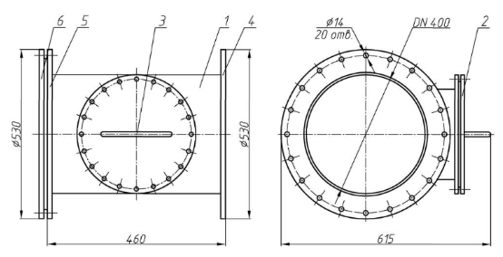 - Корпус-тройник 1 с двумя фланцами 4 и 5 по торцам и боковым люком, который позволяет визуально, а также на ощупь провести проверку состояния и, в случае надобности, прочистить место прижатия тарели клапана герметического вентиляционного (тип ГК ИА) – гермоклапана ГК ИА 01009-400 или ГК ИА 01010-400 от возможных засорений;