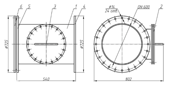 - Корпус-тройник 1 с двумя фланцами 4 и 5 по торцам и боковым люком, который позволяет визуально, а также на ощупь провести проверку состояния и, в случае надобности, прочистить место прижатия тарели клапана герметического вентиляционного (тип ГК ИА) – гермоклапана ГК ИА 01009-600 или ГК ИА 01010-600 от возможных засорений;