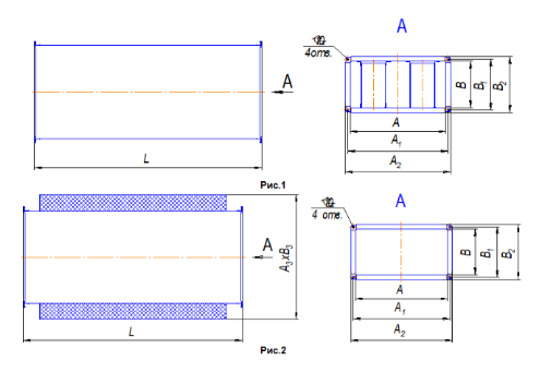 Обозначение глушителей | А, мм | А1, мм | А2, мм | А3, мм | В, мм | В1, мм | В2, мм | В3, мм | L, мм | Масса, кг | Площадь живого сечения F, м2 | Рис. |