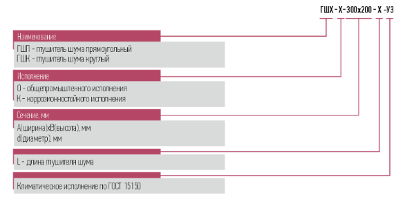 - ГШП-О-200х300-1000-У3–глушитель шума прямоугольный, общепромышленного исполнения, сечением 300x200 мм, длиной 1000 мм, для районов с умеренным климатом 3-й категории размещения.