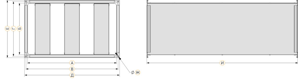 - Корпус пластинчатого шумоглушителя выполнен из оцинкованной стали марки 08ПС;