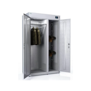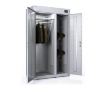 Металлический сушильный шкаф Обудежда Въ-64 позволяет одновременно высушивать 5 зимних комплектов одежды с утеплителем или 8 легких спецовок, ветровок или жилетов, а также 5 пар обуви в специальном отсеке.