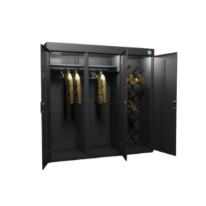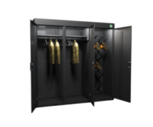 Шкаф оснащён двумя отсеками для одежды, которые комплектуются штангами и плечиками, и имеют размер, подходящий как для летних, так и для зимних комплектов спецодежды.