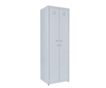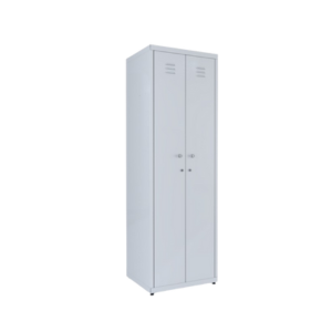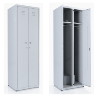 Шкаф оснащен полками для головных уборов, белья и аксессуаров, а также штангами с плечиками для подвешивания верхней одежды, такой как куртки, комбинезоны и спецовки. В нижней части шкафа предусмотрено место для размещения обуви.