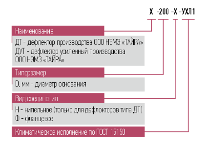 - ДТ-200-Н-УХЛ1 – дефлектор ДТ диаметром 200 мм для ниппельного соединения, климатического исполнения УХЛ1 по ГОСТ 15150.