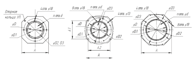 - D3 – диаметр окружности, по которой располагаются отверстия для крепления к стакану СТУМ; количество и диаметр отверстий зависит от типоразмера;