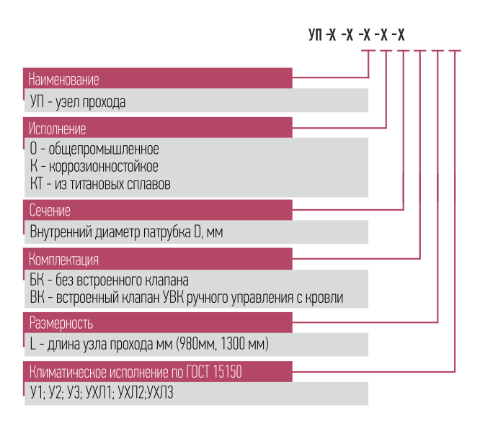 - УП-О-250-БК-980-У2 – узел прохода вентиляционных шахт, общепромышленного исполнения, с диаметром D=250 мм, без встроенного клапана, длиной 980 мм, климатического исполнения У2.