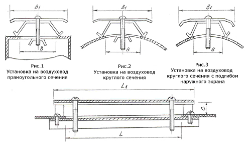 Наружный экран вытяжной установки выполнен из оцинкованной стали и устанавливается прямо в воздуховод, закрепляется винтами или сварным швом. При помощи егулировочных винтов осуществляется регулирование расхода воздуха, за счет изменения расстояния между воздуховодом и экраном.