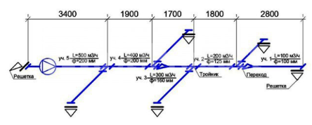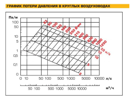 При расчете по скорости движения воздуха составляется план помещений с указанием всех элементов системы: решеток, диффузоров, вентиляторов и фильтров. Диаметры воздуховодов определяются от наиболее удаленного участка. Для удобства применяются специальные графики зависимости потерь давления от скорости потока. В соответствии с нормами СанПиН предельные скорости воздуха составляют: до 5 м/с – для жилых помещений, до 6 м/с – для офисных, до 11 м/с – для производственных объектов.