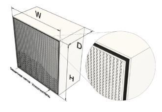 Данный фильтр состоит из рамки, выполненной из оцинкованной или нержавеющей стали, МДФ или алюминия. Внутри рамки размещен фильтрующий материал в виде складок, разделенных сепараторами из гофрированной алюминиевой фольги. Закрепление и герметизация фильтрующего материала в рамке выполняется с помощью специального герметика.