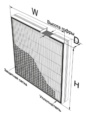 Фильтр состоит из каркаса (из оцинкованной или нержавеющей стали, МДФ или алюминия), в котором размещен фильтрующий материал. Этот материал представлен в виде пакетов, разделённых сепараторами и соединённых клеевыми нитями. Для надежной фиксации и герметизации фильтрующего материала в каркасе используется специальный герметик.