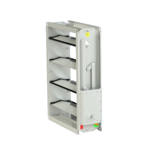 Устройство работает за счет пластинчатых створок, которые вращаются в противоположных направлениях, изменяя эффективное чистое сечение воздуховода.