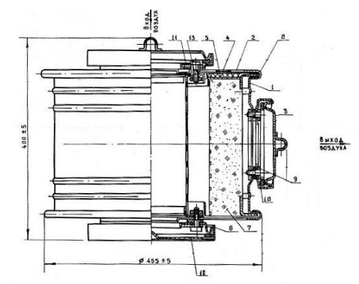 Основными комплектующими фильтров-поглотителей ФГ-70 являются: корпус 1, крышка верхняя 2, заглушка 3, табличка 4, подушка 5, кольцо ниппельное 6, катализатор 7, кольцо закатное большое 8, кольцо 9, ниппель штампованный 10, прокладка 11, донышко 12, винт 13.