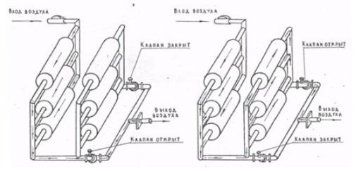 При работе установки воздух проходит сначала через первые три патрона, а затем, после их отработки, через остальные три патрона. Проходя через патроны, воздух очищается от углекислого газа и обогащается кислородом. Располагаться в помещении установка должна так, чтобы имелся свободный проход к ней со всех сторон.